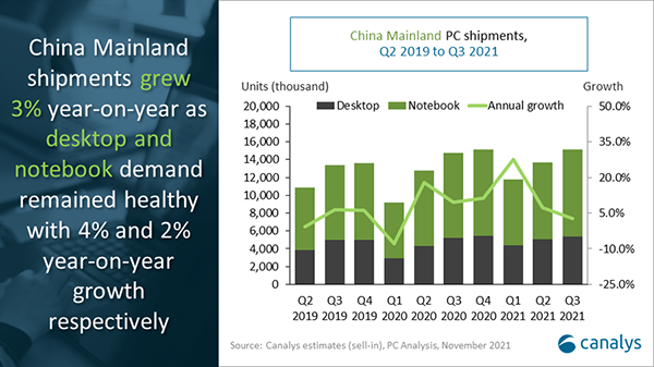 研究機構(gòu) Canalys 今日公布了 2021 年第三季度中國 PC 市場出貨數(shù)據(jù)。統(tǒng)計項目包含筆記本、臺式機以及臺式工作站。該季度中國 PC 市場出貨量超過 1500 萬臺,相比去年同期增長了 3%,環(huán)比增長 10%。