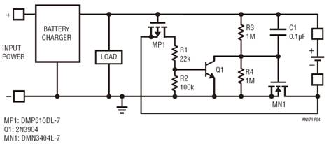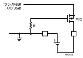 另一方面,如果充電器在電池附聯(lián)之前啟用,則 MP1 的柵極只需簡(jiǎn)單地跟隨電池充電器輸出,因?yàn)樗怯尚狗烹娮杵?R2 上拉的。未接入電池時(shí),MP1 根本沒(méi)有接通和使 MP2 脫離運(yùn)行狀態(tài)的傾向。