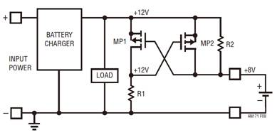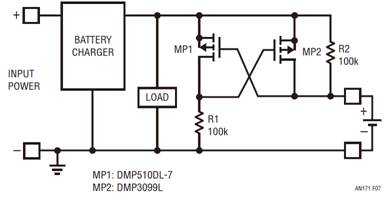 處理電源電壓反轉(zhuǎn)有幾種眾所周知的方法。最明顯的方法是在電源和負(fù)載之間連接一個(gè)二極管,但是由于二極管正向電壓的原因,這種做法會(huì)產(chǎn)生額外的功耗。雖然該方法很簡(jiǎn)潔,但是二極管在便攜式或備份應(yīng)用中是不起作用的,因?yàn)殡姵卦诔潆姇r(shí)必須吸收電流,而在不充電時(shí)則須供應(yīng)電流。