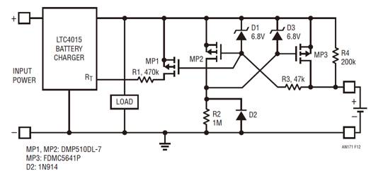 D1、D3 和 R3 保護(hù) MP2 和 MP3 的柵極免受高電壓的損壞。當(dāng)一個(gè)反接電池進(jìn)行熱插拔時(shí),D2 可防止 MP3 的柵極以及電池充電器輸出快速移動(dòng)至地電位以下。當(dāng)電路具有反接電池或處于錯(cuò)誤斷開(kāi)連接閉鎖狀態(tài)時(shí),MP1 和 R1 可檢測(cè)出來(lái),并利用缺失的 LTC4015 的 RT 特性來(lái)停用電池充電器。