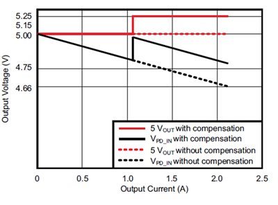 圖1:電流感測增加在負(fù)載為50%時提高輸出電壓,以應(yīng)對電壓下降