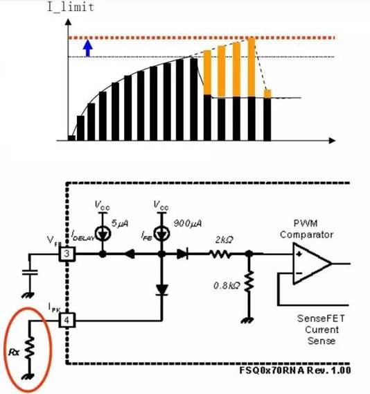 “在高壓或低壓輸入下開機(jī)(包含輕載,重載,容性負(fù)載),輸出短路,動(dòng)態(tài)負(fù)載,高溫等情況下,通過變壓器(和開關(guān)管)的電流呈非線性增長(zhǎng),當(dāng)出現(xiàn)此現(xiàn)象時(shí),電流的峰值無法預(yù)知及控制,可能導(dǎo)致電流過應(yīng)力和因此而產(chǎn)生的開關(guān)管過壓而損壞。