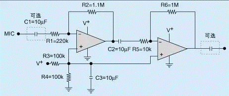 目前市場上出售的麥克風(fēng)大部分以2k(左右的高阻抗麥克風(fēng)以及只有幾百(的低阻抗麥克風(fēng)為主,這兩類麥克風(fēng)都可采用上述前置放大器設(shè)計(jì)。高阻抗高輸出麥克風(fēng)前置放大器較為簡單,可以采用非反相或反相放大器配置。由于其頻率響應(yīng)較為平坦,因此無需特別加以均衡,而且輸入電平較大,放大器對(duì)噪聲的要求很低,但高阻抗麥克風(fēng)對(duì)來歷不明的噪聲及磁場極為敏感。低阻抗低輸出麥克風(fēng)前置放大器也可采用非反相或反相放大器將輸入信號(hào)放大,頻率響應(yīng)及均衡等方面的要求都與高阻抗高輸出的前置放大器大致相同。如果麥克風(fēng)的輸出電平較低,工程師必須注意選用低噪聲的運(yùn)算放大器。如性能較好的低噪聲運(yùn)算放大器應(yīng)該產(chǎn)生較低的輸入?yún)⒄针妷涸肼,而且噪聲不?yīng)超過10nV/((Hz)。