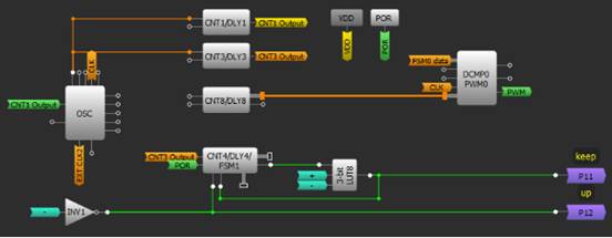 參照圖3中GreenPAK內(nèi)部的可配置單元圖示,PWM信號(hào)是使用PWM0和相應(yīng)時(shí)鐘脈沖發(fā)生器(CNT8/DLY8)生成的。由于脈沖寬度是用戶可控的,我們使用FSM0(可以連接到PWM0)來統(tǒng)計(jì)用戶數(shù)據(jù)。