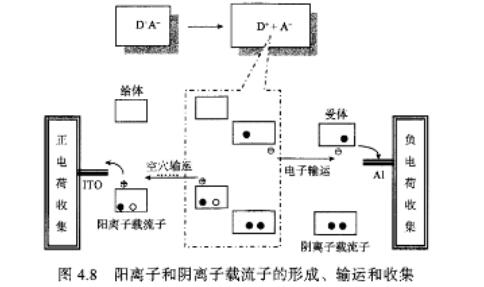圖4.7和圖4.8為給體/受體組成的有機(jī)太陽能電池工作機(jī)理示意圖?梢钥闯,器件產(chǎn)生光伏效應(yīng)的過程如下(圖4o:①當(dāng)能量大于HOMOˉLUMO能隙的光子照射時,給體分子將由基態(tài)躍遷至激發(fā)態(tài),形成激子;②中性給體激子經(jīng)過擴(kuò)散后到達(dá)給體與受體界面;③界面附近的給體激子通過界面內(nèi)建電場的輔助,克服激子中電子空穴對之間的庫侖束縛力后,進(jìn)行電荷轉(zhuǎn)移――電子由給體LUMO能級轉(zhuǎn)移到受體LUMo能級,形成電荷轉(zhuǎn)移復(fù)合物;④電荷轉(zhuǎn)移復(fù)合物中的電子空穴對需要再次克服庫侖束縛力后,才能解離為定域化的自由電荷,即陽離子載流子和陰離子載流子(圖4③;⑤正負(fù)載流子經(jīng)過輸運(yùn)分別到達(dá)陽極和陰極附近,被電極收集形成光電流。