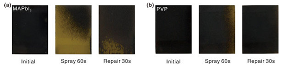 含有(a)和不含(b)聚乙烯吡咯烷酮的薄膜,顯示了水蒸氣噴涂60秒后,自修復(fù)30秒后的狀態(tài)變化