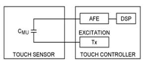 為了最大化SNR并支持兩個(gè)或多個(gè)明確的觸摸,很明顯,最理想的觸摸系統(tǒng)架構(gòu)依賴于互電容。圖1中的系統(tǒng)框圖說明了通用互電容實(shí)現(xiàn),該實(shí)現(xiàn)將激勵(lì)信號施加到觸摸傳感器電容器板之一。另一個(gè)觸摸傳感器電容器極板連接到觸摸控制器的模擬前端(AFE)。AFE輸出將轉(zhuǎn)換為數(shù)字形式,并在數(shù)字信號處理器(DSP)中進(jìn)行進(jìn)一步處理。