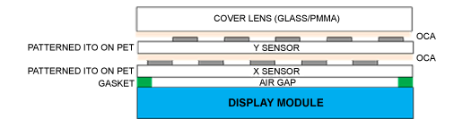 觸摸傳感器和保護(hù)蓋之間的氣隙:觸摸屏設(shè)備最終用戶報(bào)告的最常見問題之一是保護(hù)蓋損壞。為了使產(chǎn)品更薄,可以將投射電容式觸摸傳感器層壓到防護(hù)鏡的背面。然而,當(dāng)更換破裂的保護(hù)蓋透鏡時(shí),還必須更換觸摸傳感器,這增加了維修成本。為了避免這種成本以及成本和較低的覆膜良率,設(shè)備制造商通常使用薄墊片將觸摸傳感器和保護(hù)蓋分開。