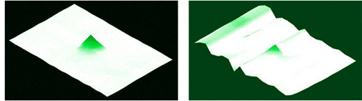 在4英寸顯示屏上的2mm導(dǎo)電筆的這些電容曲線中,左側(cè)的曲線反映了高SNR觸摸控制器的使用。右邊是一個(gè)低信噪比的觸摸控制器。測針位于綠色圓錐體的頂點(diǎn);白色表面的高度代表整個(gè)顯示器的背景噪音水平。SNR的大幅提高有效地降低了
