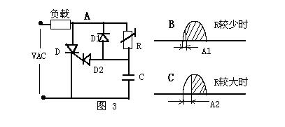 相位觸發(fā)電路實(shí)際上是交流觸發(fā)電路的一種,如圖3,這個(gè)電路的方法是利用RC回路控制觸發(fā)信號(hào)的相位。當(dāng)R值較少時(shí),RC時(shí)間常數(shù)較少,觸發(fā)信號(hào)的相移A1較少,因此負(fù)載獲得較大的電功率;當(dāng)R值較大時(shí),RC時(shí)間常數(shù)較大,觸發(fā)信號(hào)的相移A2較大,因此負(fù)載獲得較少的電功率。這個(gè)典型的電功率無級(jí)調(diào)整電路在日常生活中有很多電氣產(chǎn)品中都應(yīng)用它。