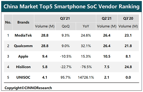 從此前 CINNO Research 的數(shù)據(jù)來看,去年 3 季度的中國市場手機(jī)處理器出貨量由聯(lián)發(fā)科和高通齊頭并進(jìn),蘋果 A 系列芯片以及紫光展銳芯片份額有所增長,而海思不管是季度還是年度都是大幅下降。