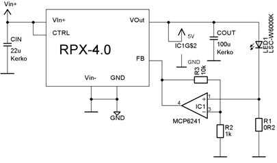 如果 LED 由電壓源供電,它們需要串聯(lián)電阻來限制電流和調(diào)整工作點,產(chǎn)生額外的功率損耗。如果使用電流源來為 LED 供電則可以避免這種情況。使用穩(wěn)壓器和運算放大器可以實現(xiàn)簡單的電路,對 LED來說具有電流源特性: