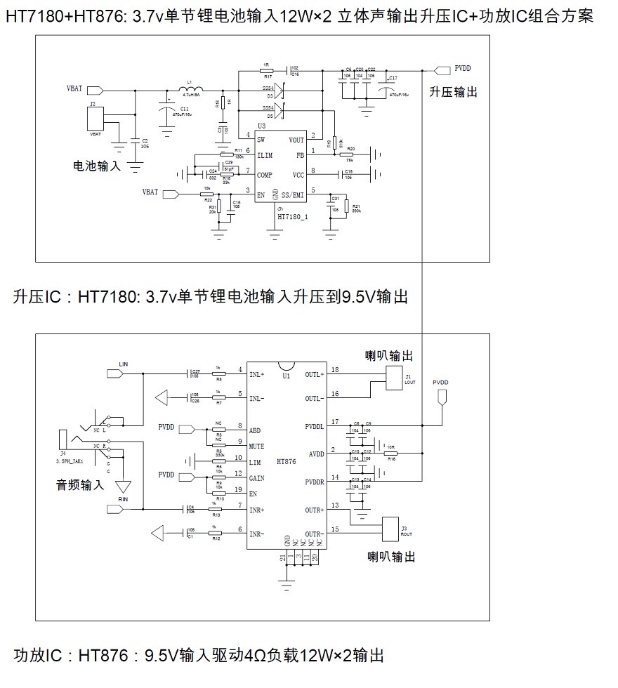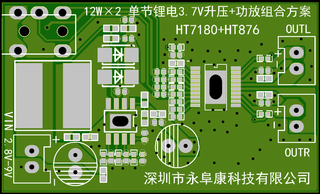 深圳市永阜康科技有限公司推出基于HT876+HT7180的單節(jié)鋰電池3.7V升壓至9.5V、2x12W立體聲升壓音頻放大組合解決方案,無需外圍MOS管、升壓效率最高達(dá)90%,外圍簡單、應(yīng)用方便。