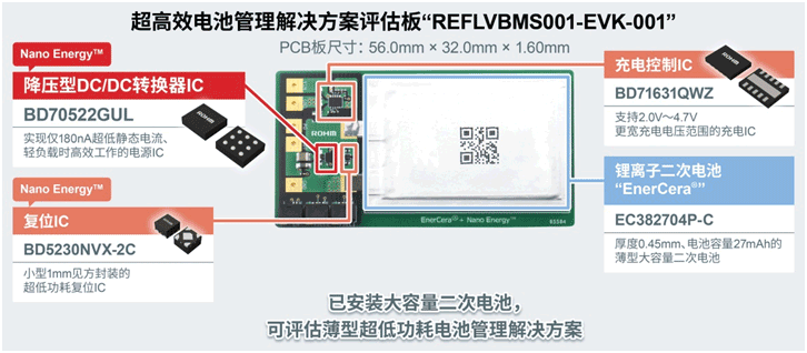 本評(píng)估板“REFLVBMS001-EVK-001”使用了厚度為0.45mm、電池容量為27mAh的二次電池“EnerCera® EC382704P-C”,由搭載了“Nano Energy™”技術(shù)的待機(jī)靜態(tài)電流180nA的超低功耗IC“BD70522GUL”作為高效電源,由支持2.0V~4.7V充電電壓的充電控制IC“BD71631QWZ”負(fù)責(zé)適合電池的充電、監(jiān)控和放電控制,這些器件共同構(gòu)成蓄電單元。包括用來(lái)檢測(cè)異常電壓的復(fù)位IC“BD5230NVX-2C”在內(nèi),待機(jī)時(shí)的靜態(tài)電流非常低,不僅可以為應(yīng)用產(chǎn)品提供毫無(wú)浪費(fèi)的電源功能,與普通的解決方案相比,還能將應(yīng)用產(chǎn)品的待機(jī)時(shí)間延長(zhǎng)60倍以上。本評(píng)估板可以輕松評(píng)估這種解決方案。此外,所有安裝元器件的厚度都在0.60mm以下,加上PCB板的厚度也僅有1.60mm的超薄厚度,因此還可以作為參考設(shè)計(jì)直接裝入卡片型物聯(lián)網(wǎng)設(shè)備(智能卡)中。