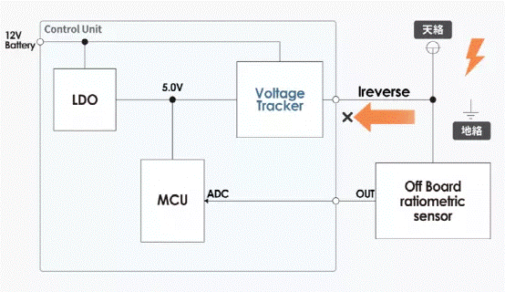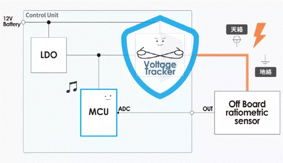 電壓跟蹤器可將分離式傳感器的電源與 ECU 的電源分開,還配備了保護功能,以保護 MCU 免受由電源短路和接地短路故障導致的不必要損壞(參見圖 3)。
