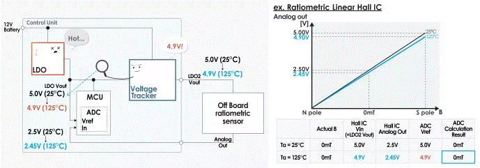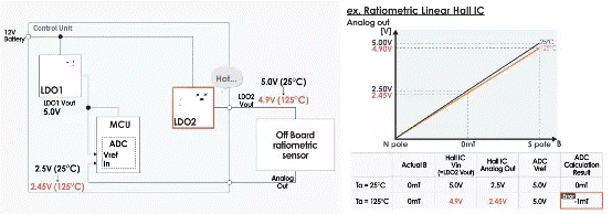 假設只有分離式傳感器的電源電壓(「LDO2」 輸出電壓)因溫度變化而從 5.0V 下降到 4.9V。當電源電壓為5.0V時,分離式傳感器的輸出信號在0mT時為2.50V,但因輸出與電源電壓成比例而下降至2.45V。因此,從 「LDO1」 接收相同的 5.0V 參考電壓的 ADC 在讀取分離式傳感器信號時出現讀取錯誤!窵DO1」 的輸出電壓出現波動時也會出現相同的結果。