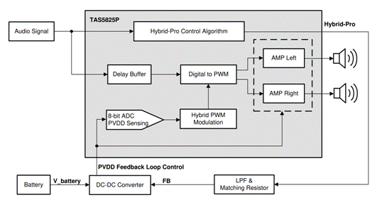 為了在不影響輸出功率的情況下提高效率,TI推出了在DSP中采用Hybrid-Pro算法的TAS5825P D類音頻放大器,該放大器通過(guò)連續(xù)分析輸入的音頻信號(hào)并向外部直流/直流轉(zhuǎn)換器提供脈寬調(diào)制反饋,可提高系統(tǒng)效率并降低沒(méi)必要的損耗。利用反饋,直流/直流轉(zhuǎn)換器可在音頻峰值需要時(shí)增大電源電壓,并在不需要更高的輸出功率時(shí)降低電源電壓。該功能可在低音量播放音頻時(shí)降低功耗并提高效率,同時(shí)不會(huì)限制放大器提供最大輸出功率的能力。圖1顯示了TAS5825P的方框圖。