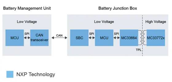 高壓系統(tǒng)通信的一個挑戰(zhàn)是將低壓半導(dǎo)體 (12 V) 與高壓 (400 V) 電池側(cè)隔離開來。在這里,BMU(電池管理單元) 的通信傳統(tǒng)上是通過 CAN 總線進(jìn)行的,但通過變壓器物理層 (TPL) 以菊花鏈方式連接 BJB 是一種有吸引力的替代方案。TPL 接口專為 BMS 設(shè)計,支持高達(dá) 2kV 的高隔離電壓。這種解決方案的好處包括更強(qiáng)大的電磁兼容性 (EMC) 特性、更高的高壓隔離、更好的通信速度和同步測量。從而降低了軟件相關(guān)的復(fù)雜性并降低了 BOM 成本。