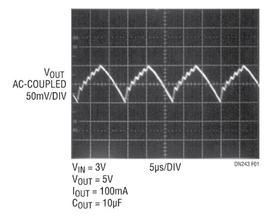 即使采用小型輸出電容器,器件的2MHz振蕩頻率也可允許低輸出紋波,圖2給出了LTC3200-5采用不同值的輸出電容器支持100mA負(fù)載電流時(shí)的輸出紋波情況。