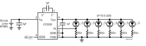 充電泵通常為手機(jī)和PDA等手持電子設(shè)備提供低功率升壓轉(zhuǎn)換。這些設(shè)備,尤其是那些含有RF通訊電路的產(chǎn)品,對(duì)噪聲十分敏感。低噪聲充電泵的一個(gè)流行應(yīng)用是給白光LED供電,以便為小型彩色LCD顯示器提供背光。圖4所示的電路是一低噪聲升壓電源,最多可驅(qū)動(dòng)6只白光LED,LTC3200的FB引腳用來調(diào)節(jié)流經(jīng)每只LED鎮(zhèn)流管上的LED電流。采用LTC3200,用戶可直接利用電池為背光電路提供升壓電源,免除了笨拙的低頻噪聲過濾問題。