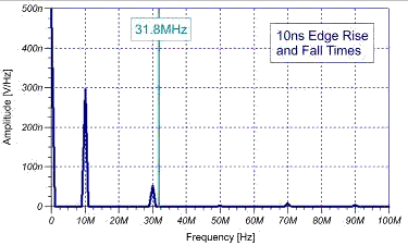 10 ns 邊緣率時(shí)方程式結(jié)果為約 31.8 MHz。曲線圖顯示,最后一次明顯諧波出現(xiàn)在30 MHz。同時(shí),圖 2 所示 1 ns 邊緣率時(shí)方程式結(jié)果為 318 MHz 最大頻率。如果您的電路易受 318 MHz 頻帶內(nèi)產(chǎn)生的頻率影響,則 EMI 諧波可能會(huì)使您的電路出現(xiàn)干擾。