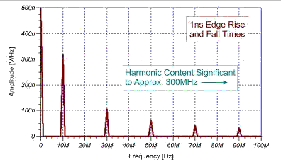 您可以將某個(gè)數(shù)字信號(hào)的頻譜成分簡化為其頻率和升時(shí)間。時(shí)鐘或者系統(tǒng)頻率建立電路的時(shí)間基準(zhǔn),但其邊緣率形成干擾諧波。圖 1 顯示了一個(gè) 10 MHz 方波的頻譜成分。該 10 MHz 信號(hào)的邊緣率為 10 ns。請(qǐng)注意,圖 1 中這些諧波的量級(jí)隨頻率降低。一般而言,這種信號(hào)的潛在 EMI 為: