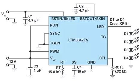圖1. LTM8042驅(qū)動(dòng)四個(gè)LED,其中 VIN = 5.75 V 至 10.25 V and IOUT = 0.5 A