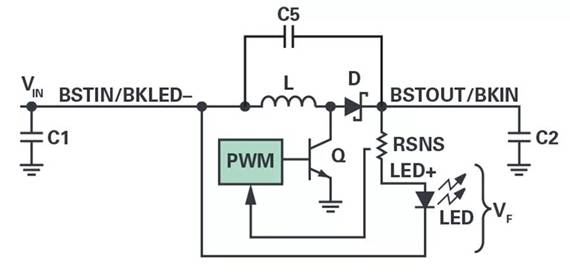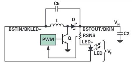 在許多商用電池和太陽(yáng)能供電應(yīng)用中,輸入電壓變化范圍很廣。在這些情況下,最合適使用圖4所示的降壓-升壓拓?fù)。輸入電壓和LED陰極連接到BSTIN/BKLED–終端。當(dāng)晶體管Q導(dǎo)通時(shí),電流在電感L中積聚。一旦Q關(guān)斷,L上的電壓就會(huì)改變極性,使二極管D正偏,同時(shí)電壓攀升超過輸入電平。PWM使流經(jīng) LED和C5的電流保持在設(shè)定值不變,C2充當(dāng)輸出濾波器。LED燈串電壓 VF 可以低于或高于 VIN。