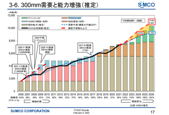 硅晶圓制造龍頭 Sumco 近期也預(yù)測(cè),硅晶圓短缺將持續(xù)到 2023 年以后,該公司的 300mm 硅晶圓基本都是簽至 2026 年的長(zhǎng)約。2021 年硅晶圓價(jià)格上漲了 10%,價(jià)格也上漲了 10%,預(yù)計(jì)這種增長(zhǎng)勢(shì)頭將持續(xù)至少三年。