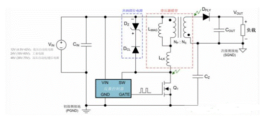 圖 1:采用典型的 24V 電源或 12V/48V 輸入(分別用于工業(yè)或汽車電池應(yīng)用)的 DC-DC 反激式穩(wěn)壓器。圖中已明確標出具有磁化作用的反激式變壓器、漏電感以及電路寄生電容