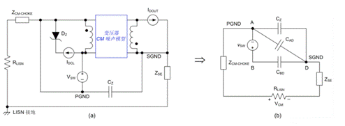 4. 用圖 5a 中最能簡化 CM 噪聲分析的其中一個雙電容模型替換原來的變壓器。