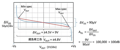 所以對(duì)于開(kāi)環(huán)增益的定義,很多廠商(比如TI), 會(huì)在一個(gè)較大的輸出擺動(dòng)范圍求其平均值,以實(shí)現(xiàn)良好的線性運(yùn)行。比如選擇電源正軌道-0.6V,負(fù)軌道+0.6V來(lái)計(jì)算開(kāi)環(huán)增益,如上圖紅線。