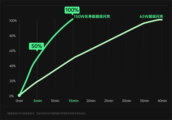 此外,OPPO 還同時(shí)發(fā)布了長壽版 150W 超級(jí)閃充,沿用 OPPO 電荷泵直充技術(shù), 5 分鐘即可將等效 4500mAh 電池容量的手機(jī)從 1% 最高充至 50%,最快 15 分鐘充至 100%。