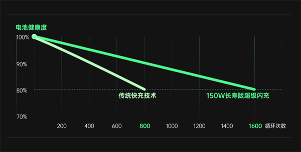 官方稱,長壽版 150W 超級(jí)閃充在提升快速充電功率的同時(shí),搭載 OPPO 自研的電池健康引擎,幫助手機(jī)在滿充滿放循環(huán) 1600 次后,電池還能擁有 80% 容量,使電池的壽命達(dá)到行業(yè)標(biāo)準(zhǔn)的兩倍,有效保護(hù)電池健康。