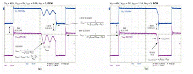 2:以 DCM (a) 和 BCM (b) 模式運(yùn)行的反激式轉(zhuǎn)換器初級(jí)側(cè) MOSFET 和次級(jí)側(cè)二極管電壓波形;跨越初級(jí)側(cè)繞組的 DZ