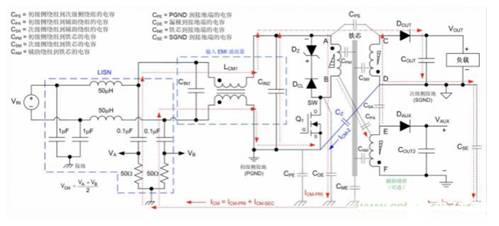 噪聲電流傳播路徑。同時(shí),還顯示了初級(jí)側(cè)基準(zhǔn)的輔助輸出端