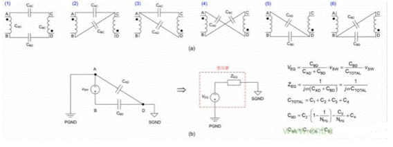 5a 所示,可能的雙電容繞組電容模型總共有六種。圖 5b 顯示了其中一種可能的雙電容 CM 模型實(shí)現(xiàn)方案(使用電容 CAD和