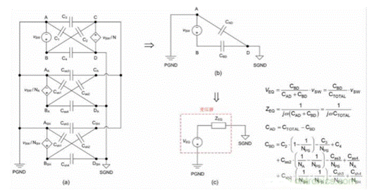 6:(a) 多繞組反激式變壓器集總 CM 寄生電容模型;(b) 雙電容 CM 模型;(c) 戴維寧等效電路