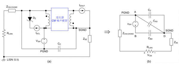 7:(a) 基于替換定理的反激式電路模型;(b) 應(yīng)用疊加定理后反激式穩(wěn)壓器的最終 CM 模型