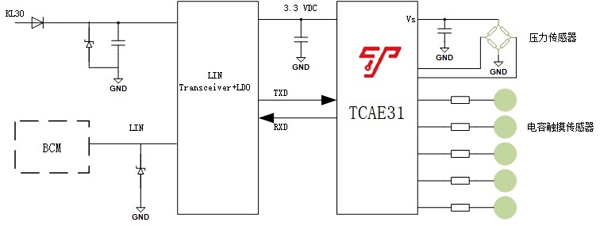 TCAE31-QDA2包含TACE11-QDA2的所有電容觸控功能,另外還集成了惠斯通電橋模擬前端電路,包括低噪聲電壓源,2級最高1024倍增益放大PGA, 高精度ADC,失調(diào)電壓動態(tài)補(bǔ)償?shù)入娐穯卧蓪?shí)現(xiàn)22 bits寬動態(tài)和最小3.6uV信號測量,適合于外接多種形式的電橋類傳感器用于壓力檢測和測量功能,適用于MEMS壓感,應(yīng)變片壓感,及電阻壓感等多種壓力傳感器的信號調(diào)理和采集及算法處理。是全球首款同時集成電容觸控和壓力觸控的車規(guī)級SoC芯片。TCAE31-QDA2充分考慮了實(shí)際應(yīng)用中可能面臨的復(fù)雜變化要素,如由于裝配,溫度,濕度,老化,干擾等引起的參數(shù)變化,通過寬范圍實(shí)時動態(tài)補(bǔ)償結(jié)合智能演算法實(shí)現(xiàn)壓力檢測的持續(xù)可靠性。再結(jié)合電容觸摸通道,實(shí)現(xiàn)電容+壓感復(fù)合智能按鍵,可真正實(shí)現(xiàn)汽車應(yīng)用所須的高抗干擾,防誤觸,防水等高可靠性要求,適用于如智能表面,智能B柱,智能中控,智能Logo,智能門把手等復(fù)雜車內(nèi)和車外應(yīng)用環(huán)境。