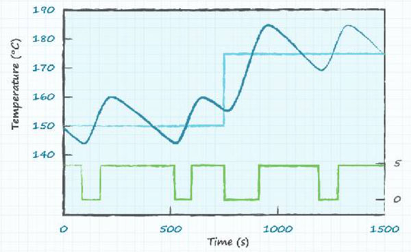 下圖有助于說明由于啟/停風(fēng)扇來控制應(yīng)用中的熱滯后而引起的熱過沖難題。該圖以步進(jìn)變化(淺藍(lán)色)、風(fēng)扇啟/停循環(huán)(綠色)和實(shí)際溫度(深藍(lán)色)繪制出所需設(shè)定的溫度。