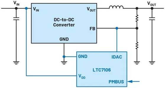 LTC7106具有一個(gè)電流輸出,其電流饋入電阻分壓器,因此對(duì)于不同的輸出電壓,開(kāi)關(guān)穩(wěn)壓器IC的基準(zhǔn)電壓出現(xiàn)在開(kāi)關(guān)穩(wěn)壓器的FB引腳上。這樣,當(dāng)FB引腳收到所需的調(diào)節(jié)電壓時(shí),輸出電壓即被設(shè)定。
