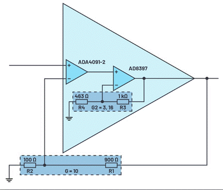 但是,您可以使用兩個(gè)單獨(dú)的放大器來構(gòu)建這種放大器,形成復(fù)合放大器。將兩個(gè)運(yùn)算放大器組合在一起,就能將各自的優(yōu)勢特性集成于一體。這樣,與具有相同增益的單個(gè)放大器相比,兩個(gè)運(yùn)算放大器組合可以實(shí)現(xiàn)更高的帶寬。