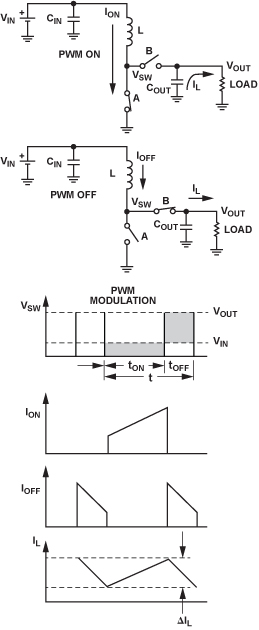 現(xiàn)代低功耗同步降壓調(diào)節(jié)器以脈寬調(diào)制(PWM)為主要工作模式。PWM保持頻率不變,通過改變脈沖寬度(tON)來調(diào)整輸出電壓。輸送的平均功率與占空 D成正比,因此這是一種向負載 提供功率的有效方式