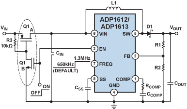 使用肖特基二極管代替開關(guān)B的調(diào)節(jié)器定義為異步 (或非同步), 調(diào)節(jié)器,而使用FET作為開關(guān)B的調(diào)節(jié)器定義為同步調(diào)節(jié)器。 圖3中,開關(guān)A和B已分別使用內(nèi)部NFET和外部肖特基二極管 來實施,從而形成異步升壓調(diào)節(jié)器。對于需要負載隔離和低關(guān) 斷電流的低功耗應用,可添加外部FET,如圖4所示。將器件 的EN引腳驅(qū)動至0.3 V以下便可關(guān)斷調(diào)節(jié)器,使輸入與輸出完 全斷開。