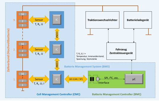 作為核心組件,電池管理系統(tǒng) (BMS) 負(fù)責(zé)電池的正確管理和監(jiān)測(cè)。目前,電動(dòng)汽車(chē)采用鋰離子電池。這些電池連接在一起使電池組達(dá)到所需總電壓。現(xiàn)有單體電池電壓約為3.6 V至3.7 V,動(dòng)力電池520 V或900 V高壓系統(tǒng)需要約140至250節(jié)電池。這種配置中,必須監(jiān)測(cè)電池的溫度、阻抗(電池內(nèi)阻)、電壓以及充放電電流。