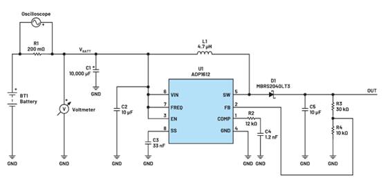 之后,將圖1所示的電路轉換為自舉配置。自舉涉及到將ADP1612的VIN引腳連接至輸出電壓。該部分啟動后,由更高的輸出電壓供電,因此會產生更強的驅動力來驅動FET,但ADP1612并不知道電池的電壓水平。經過修改的電路如圖4所示。