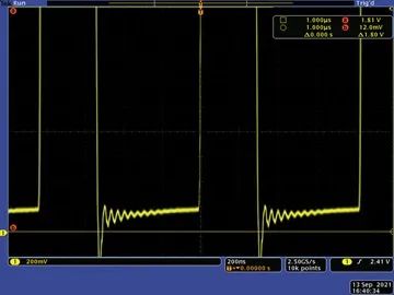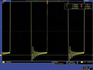 通過探測開關節(jié)點(SW),可以深入了解DC-DC轉換器是如何工作的。在FET接通時,電感電流升高,導致開關節(jié)點的底部電壓升高,幅度與FET的導通電阻成正比。此電壓越低,F(xiàn)ET的導通電阻越低。因此,在給定電流下,F(xiàn)ET中的損耗也越低。圖2顯示了采用非自舉配置的開關節(jié)點,電池電壓為2 V。開關節(jié)點的底部電壓峰值約為180 mV。