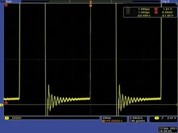 將電池電壓增大到3 V,可以得出圖3所示的開關節(jié)點波形。我們注意到,隨著電池電壓升高,占空比走低,此外,開關節(jié)點下半部的電壓明顯更低,峰值為約80 mV。但是,由于3 V電池電壓的FET電流低于2 V電池電壓,所以很難看出導通電阻是否確實降低。