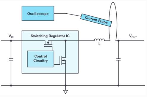 圖1以典型的降壓型轉(zhuǎn)換器(降壓拓撲)為例,顯示了針對這類測量的建議設(shè)置。接入一根輔助小電纜與電感串聯(lián)。將它用來連接一個電流探頭,并通過示波器顯示電感電流。建議在電感具有穩(wěn)定電壓的那一側(cè)進行測量。